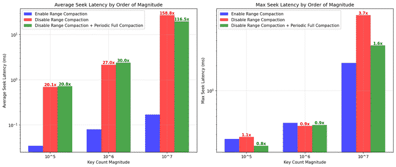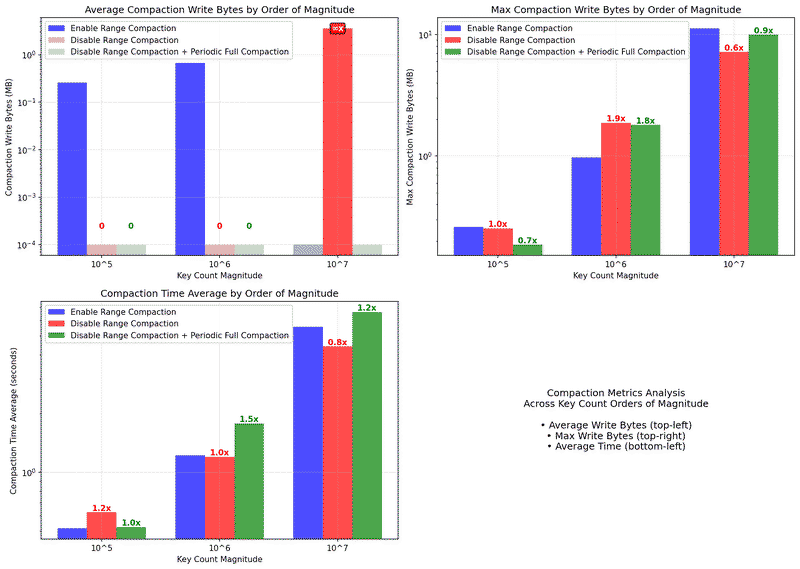 - Average compaction time: Generally decreases or remains similar (5.5s vs 4.4s at 10⁷ keys)