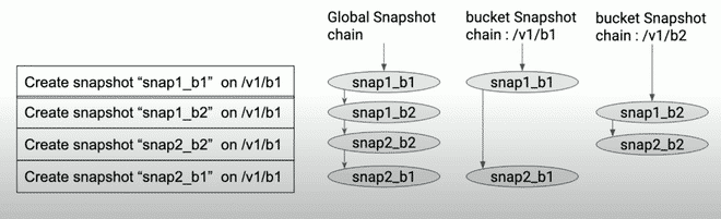 - path snapshot chain:每個 volume/bucket 維護自己的 snapshot chain (按照時間順序連接), 主要是 Snapshot Diff 會使用到