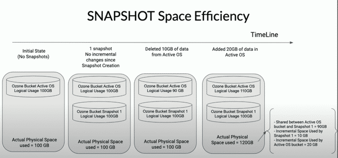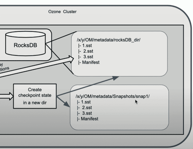 Exploring Apache Ozone Snapshots:粗略介紹 Ozone Snapshot 有哪些功能:(1. 支援使用者在 bucket 層級進行 Snapshot 操作,讓你可以在任意時刻快速凍結、保存 bucket 當下的狀態。(2. Snapshot 操作即時完成,並可透過專屬的檔案系統路徑直接存取 Snapshot 內容。(3. 使用者可列出所有 Snapshot 、比對不同 Snapshot 間的差異(Snapshot Diff),甚至從 Snapshot 還原資料。(4. Snapshot 為唯讀、可獨立刪除,也不會因主存儲區資料被刪除而失效。