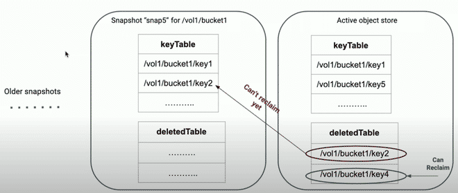 其實這樣想沒錯 但是考慮到 snapshot-aware 的問題, 如果 DeletingService 在清理 deletedTable/deletedDirectoryTable 的 key/file/dir 的時候, 需要把所有 snapshot 都翻出來看他們有沒有包含那個 key/file/dir。這樣很浪費時間